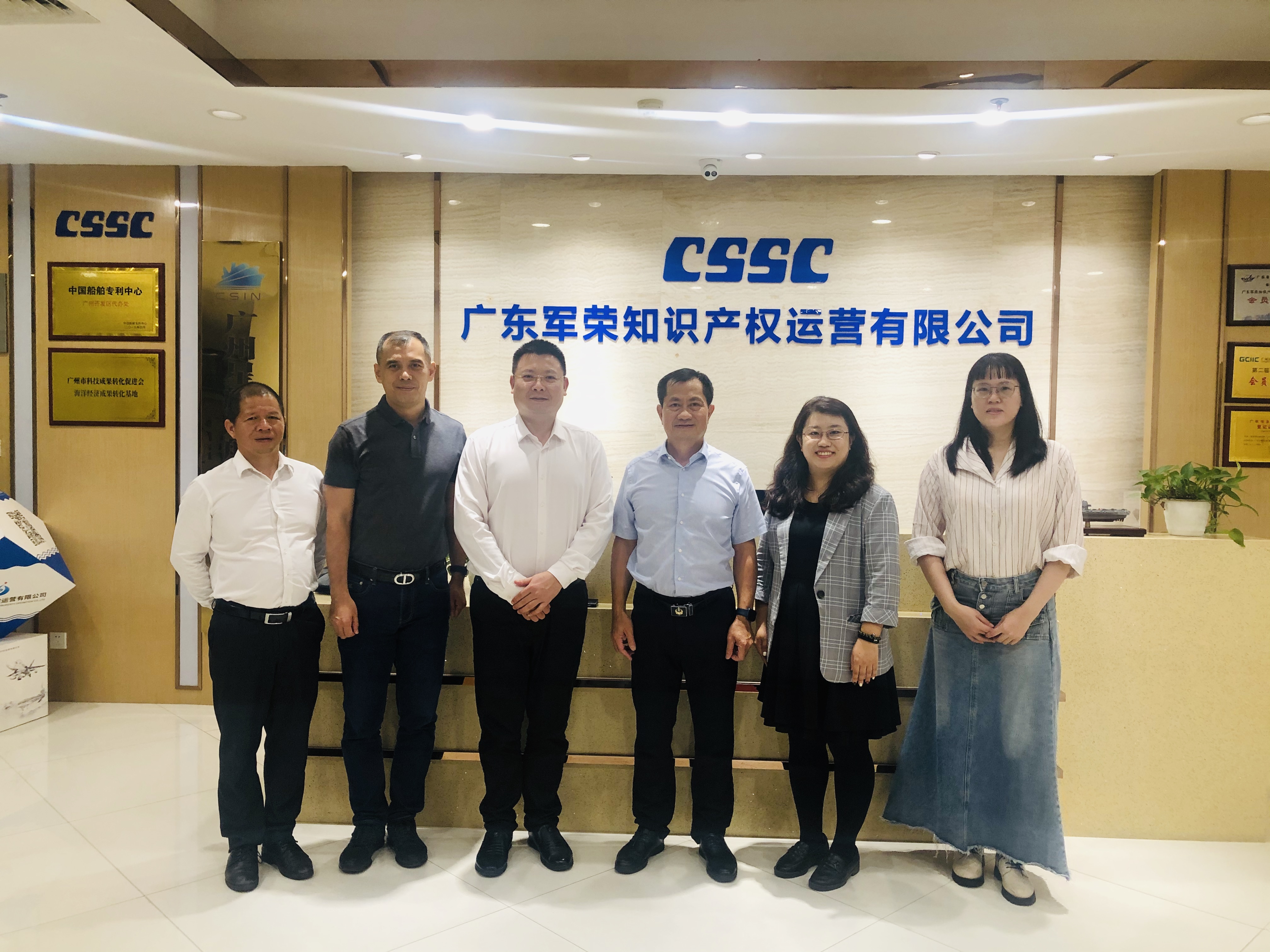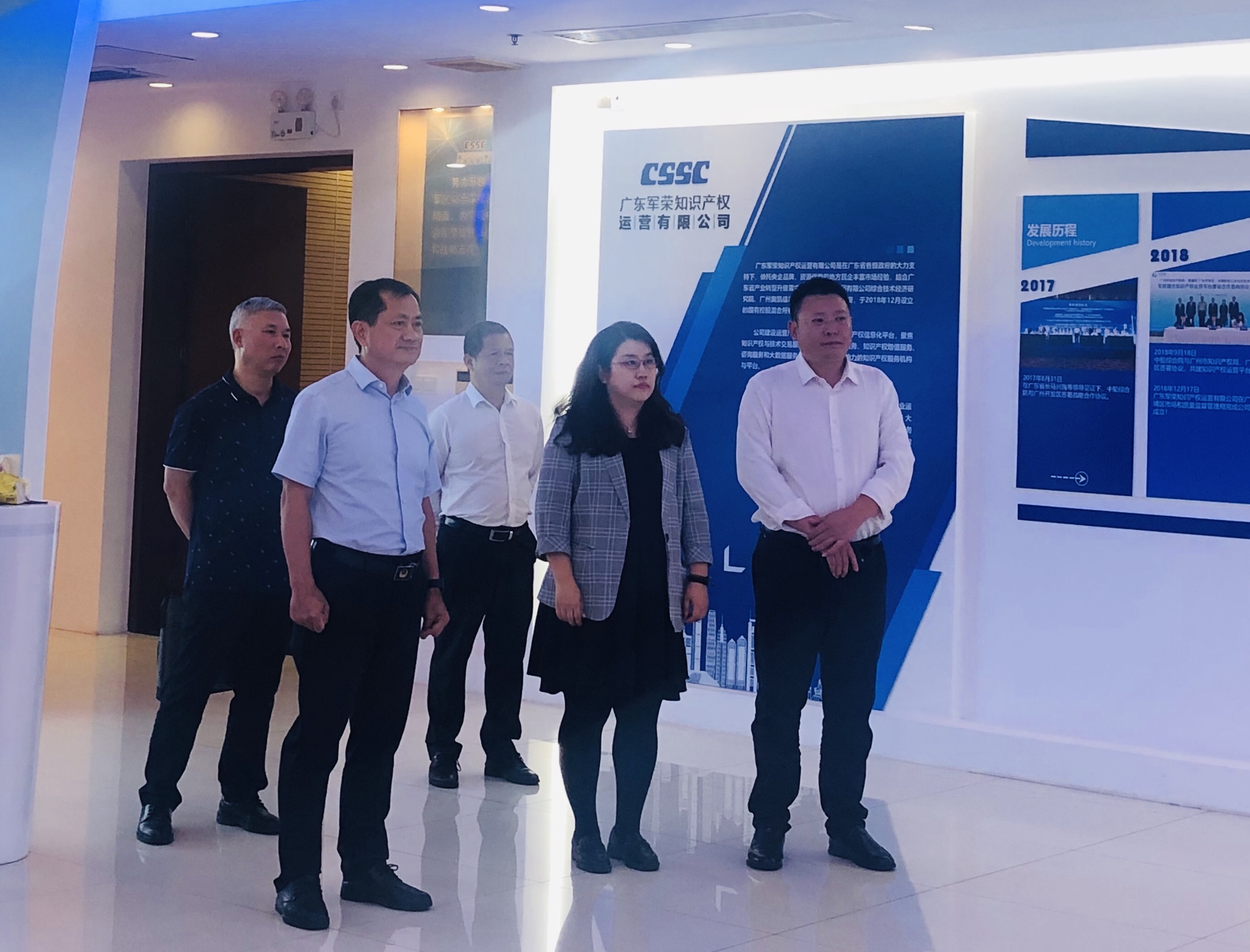 10月26日,广州市市场监督管理局(知识产权局)副局长蓝伟宁、知识产权保护处处长万众一行到广东军荣知识产权运营有限公司调研,广东军荣总经理栾硕、副总经理马祥特等向蓝伟宁一行汇报了广东军荣的业务板块、工作进展、近期工作设想,以及中国船舶集团知识产权与成果管理的情况。