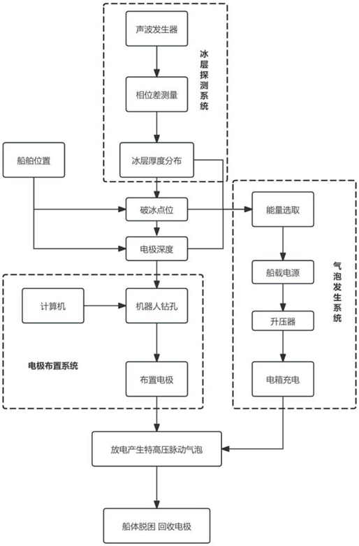 技术方案:采用极地船载特高压脉冲放电气泡破冰系统,通过声波探测系统测量冰层厚度,结合船体的安全位置确定安全易破点,利用机器人在易破点设计孔位钻孔并布置电极,利用特高压脉冲气泡发生模块在冰层下产生气泡,实现破冰。