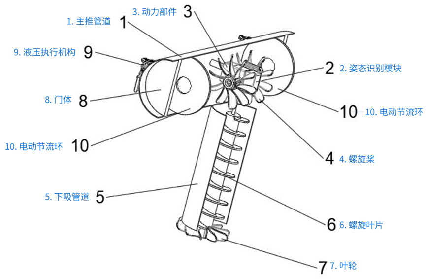技术方案:采用主推管道、姿态识别模块、电动阀门、动力部件和螺旋桨的组合设计,结合智能控制器实现动态调节,通过姿态识别模块检测船舶倾斜角度,控制器调节螺旋桨旋转方向和水流流量,配合温控除冰部件和电动节流环,确保水流顺畅和推进力稳定。