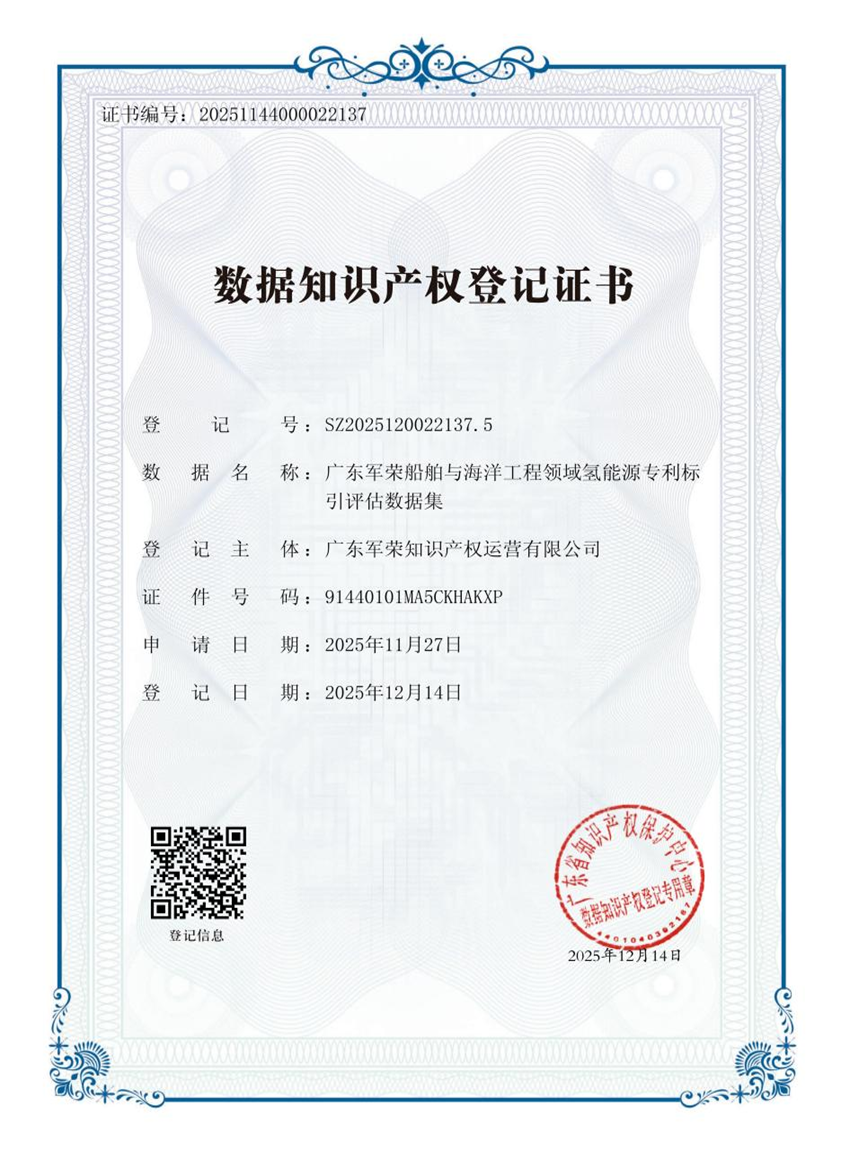 2025年11月14日,广东军荣知识产权运营有限公司(以下简称“广东军荣”)开发的“广东军荣船舶与海洋工程领域氢能源专利标引评估数据集”获颁广东省数据知识产权登记证书,标志着广东军荣在数据要素市场化配置和数据知识产权保护方面迈出关键一步,为推动氢能技术在船舶领域的创新应用提供了坚实的数据支撑。