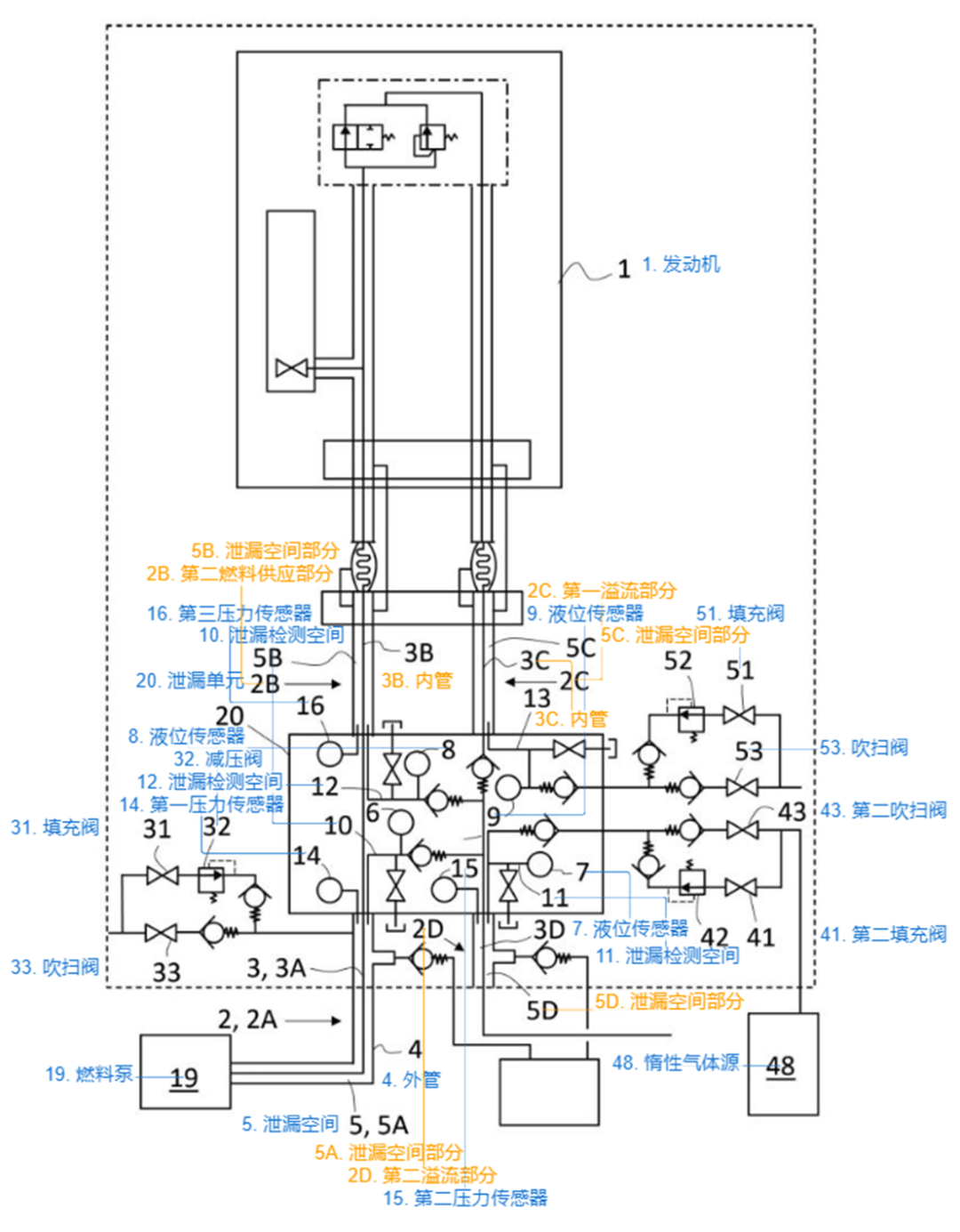 技术方案:采用双壁燃料管线和惰性气体吹扫技术,通过在泄漏空间中维持惰性气氛,监测并吹扫泄漏,使用压力传感器和液位传感器检测泄漏,并在检测到泄漏时切换燃料或关闭发动机,确保安全操作。