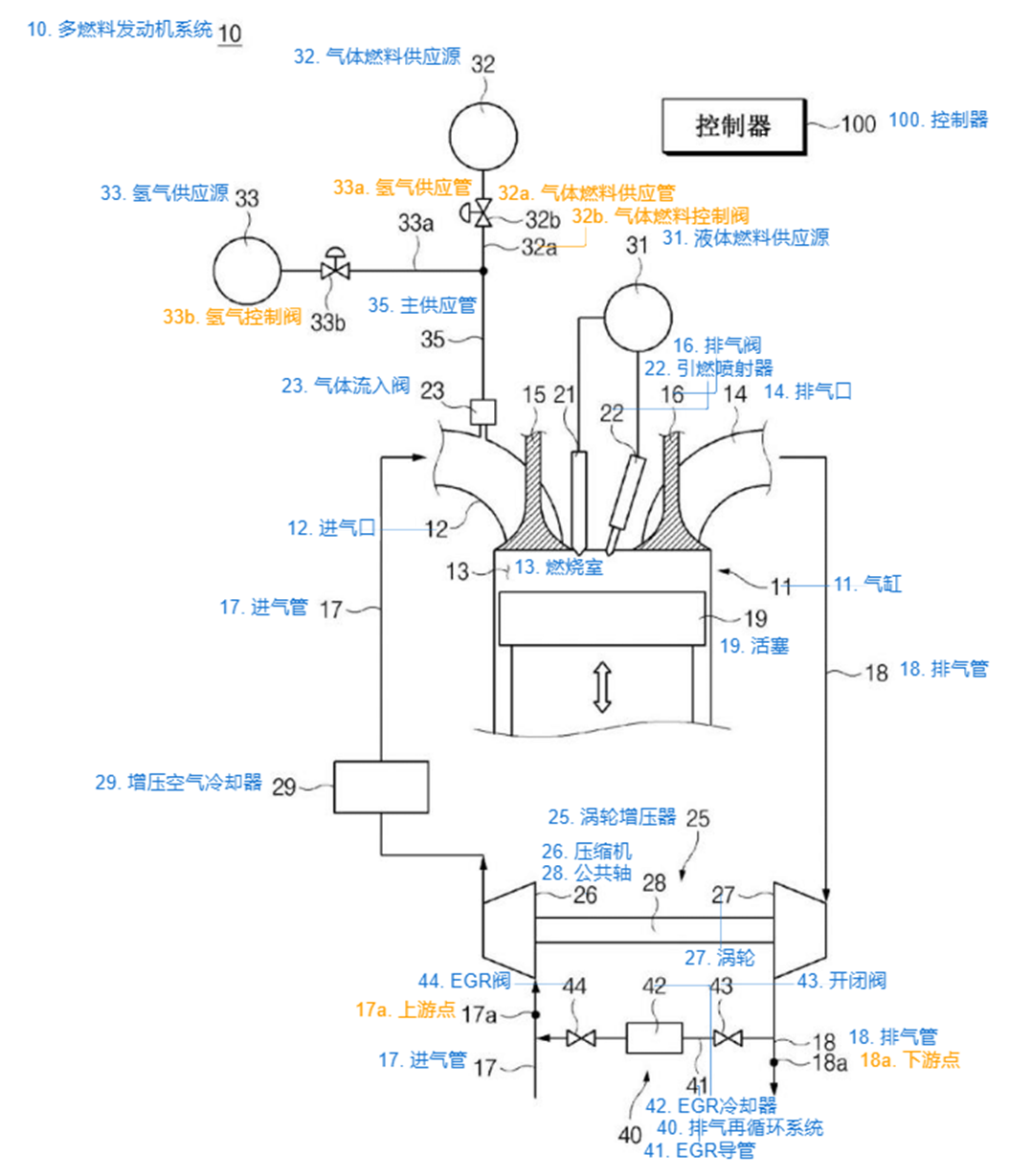 技术方案:通过在多燃料发动机系统中检测气缸的最大压力和燃烧中心,调节氢气与气体燃料的比例和排气再循环率(EGR),以优化氢气和气体燃料的混合比例,实现稳定燃烧和减少温室气体排放。